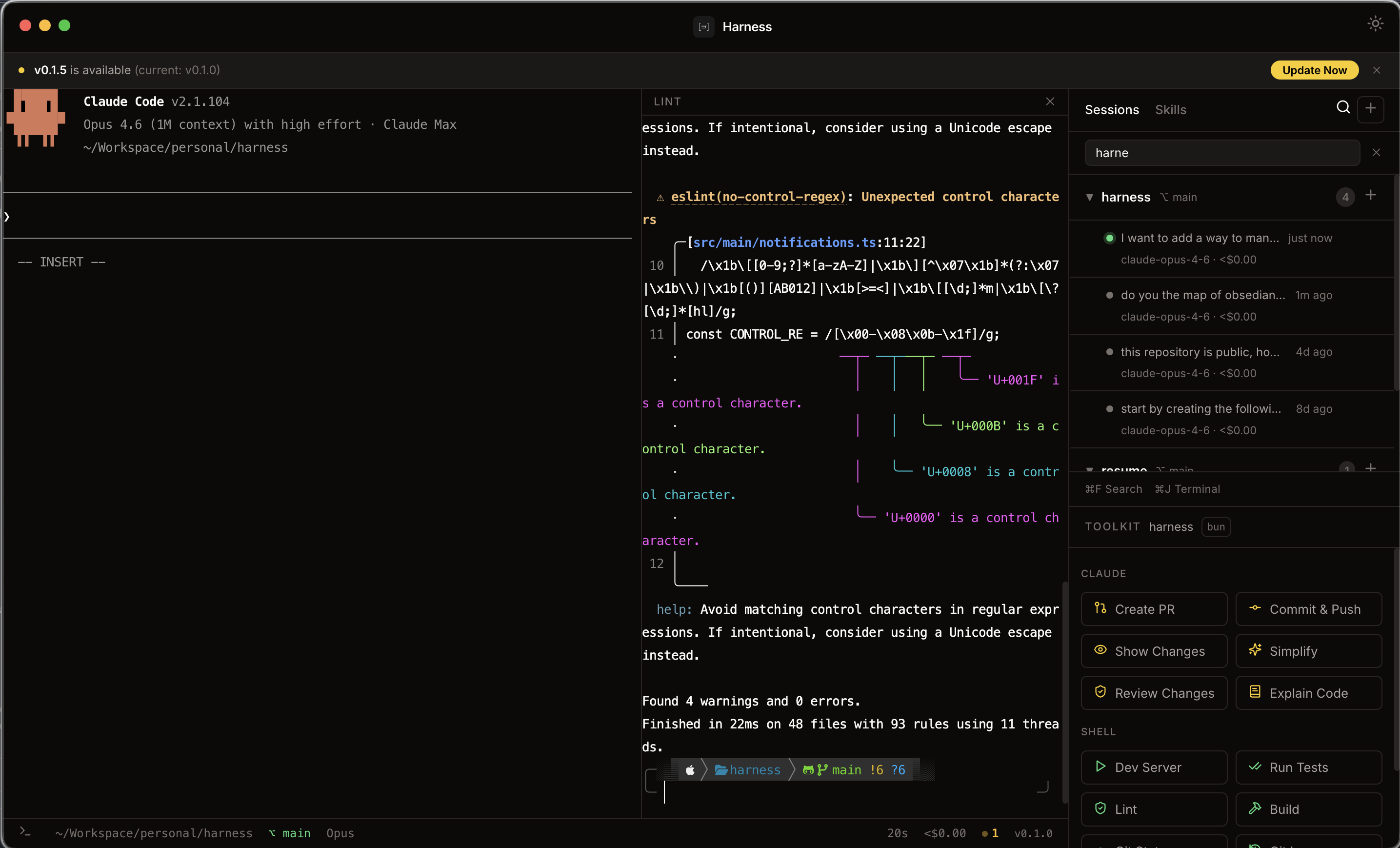 Harness is a desktop app I built to solve this. It wraps Claude Code in an Electron shell that gives you a persistent sidebar of all your sessions, an embedded terminal with split panes, and a set of quick actions for the things I do fifty times a day: creating PRs, committing, reviewing diffs, editing skills and CLAUDE.md files.